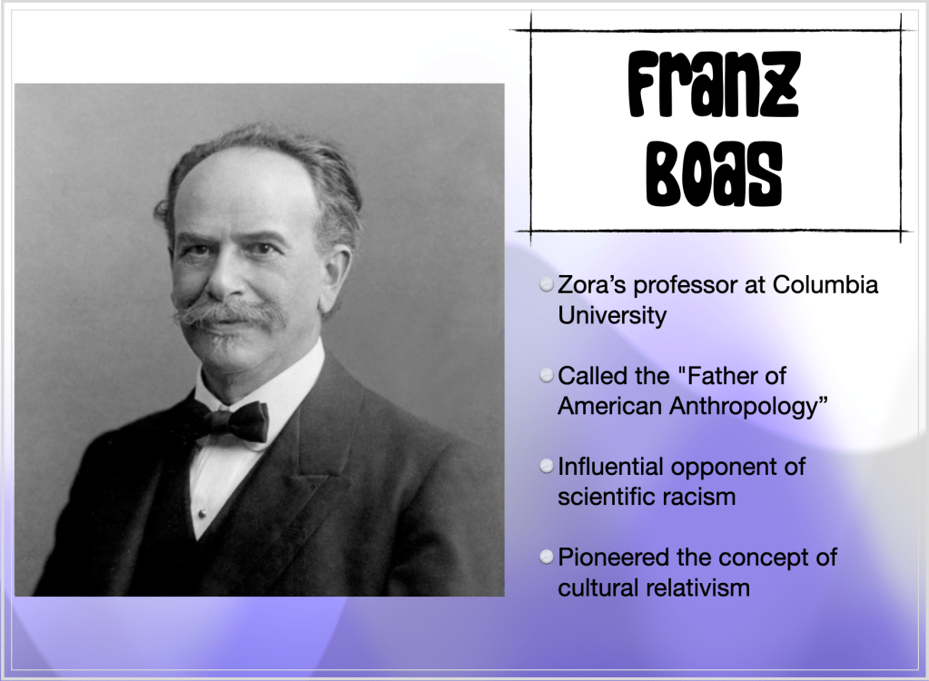 Zora began collecting African-American stories, songs, and other cultural practices under the guidance of her anthropology professor at Columbia University in New York City. Her teacher was none other than the esteemed Franz Boas, who would later become known as the “Father of American Anthropology.”